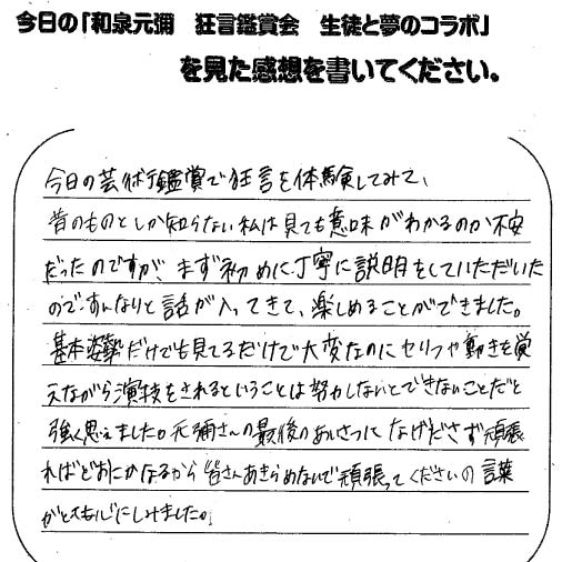 多数の代表生徒にステージ上で本格的な狂言の「舞い」を体験していただきます!